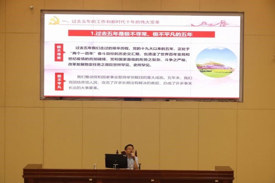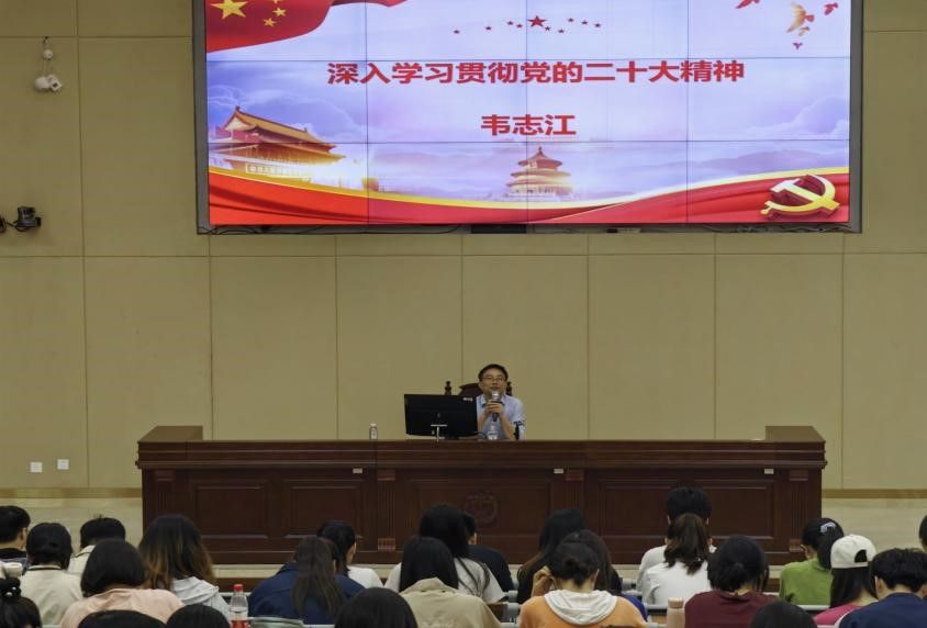 韦志江主要从以下三个部分开展党的二十大精神的宣讲:一是过去五年的工作和新时代十年的伟大变革;二是新时代新征程中国共产党的使命任务;三是全面建设社会主义现代化国家的战略安排及重要任务。最后,他号召同学们要脚踏实地,扎扎实实走好当下的每一步,要立志做怀抱梦想又脚踏实地的新时代好青年。