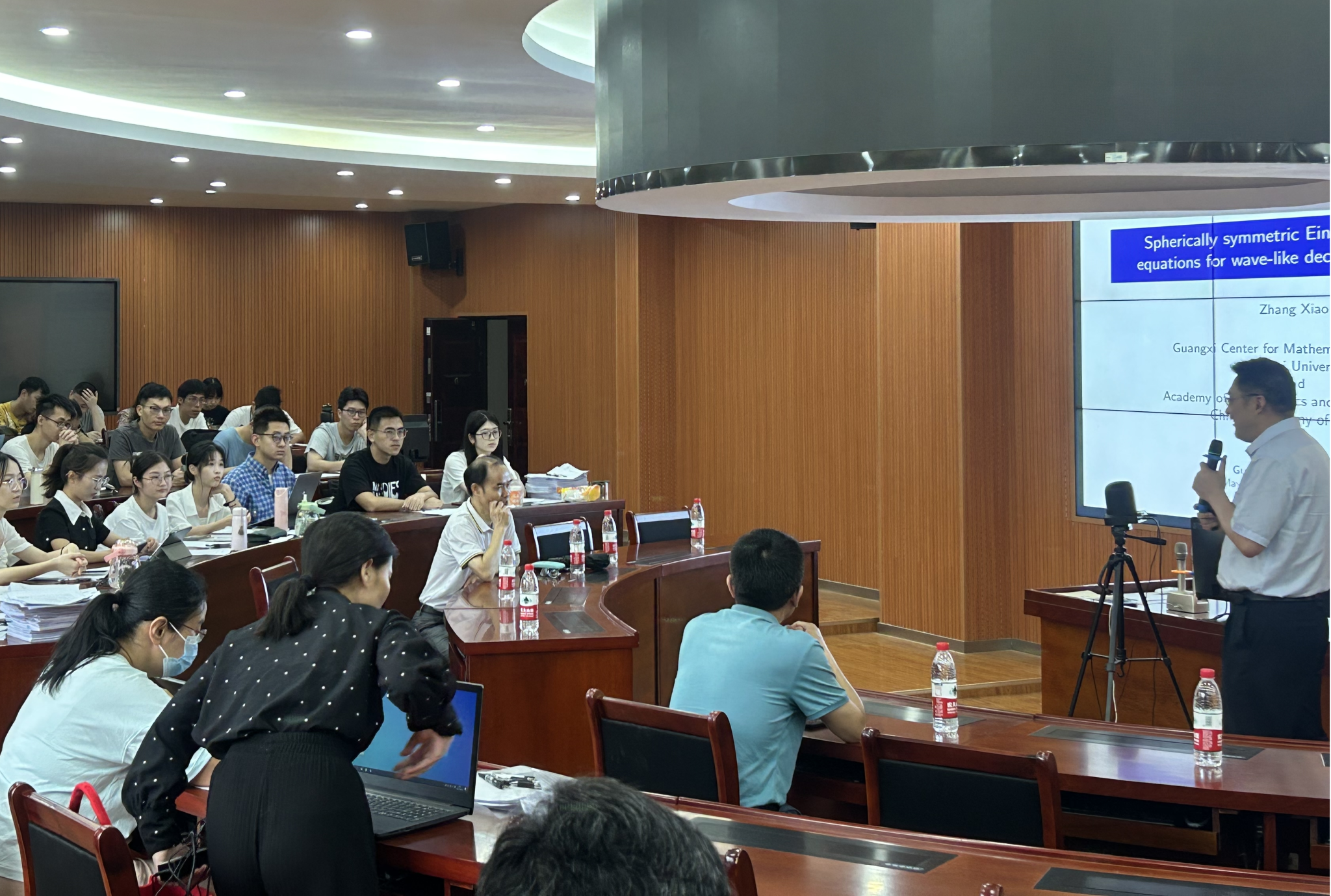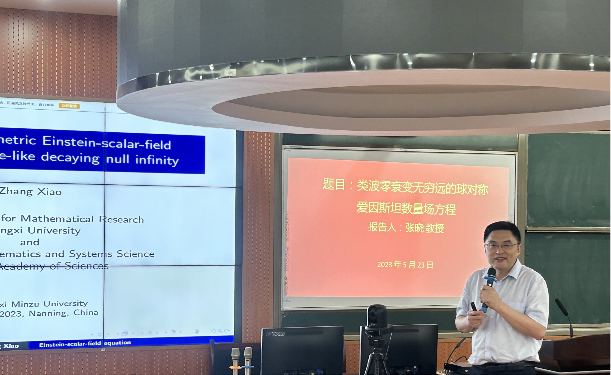在学术报告中,广西大学张晓教授作了题为“类波零衰变无穷远的球对称爱因斯坦数量场方程”的报告。张晓教授从微分几何与数学物理的角度出发,其一涉及了爱因斯坦的数量场方程及广义相对论,讲解了研究证明符合天文观察数据的正宇宙常数情形的正能量定理、零宇宙常数Kerr约束以及类光无穷远的正能量定理,并以此给出了引力波Bondi能量正性的数学证明,其二阐述了球对称爱因斯坦数量场方程类波解的存在唯一性,其三张晓教授阐释了黑洞是广义相对论爱因斯坦方程的奇异解,并对为什么称为黑洞进行了说明。并阐释了构造不可蒸发量子黑洞的数学模型的相关问题。