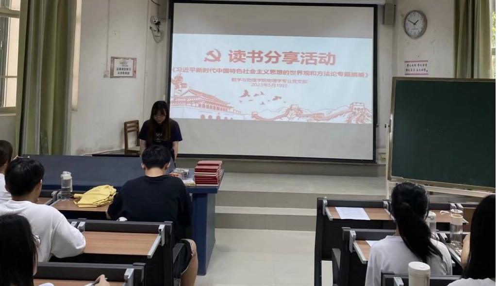 2023年5月19日,物理专业员工党支部在创新楼六梯开展学习贯彻习近平新时代中国特色社会主义思想主题教育读书分享会,专题学习《习近平新时代中国特色社会主义思想的世界观和方法论专题摘编》。支部党员蓝一烨同志主持,党支部全体党员及入党积极分子参加。
