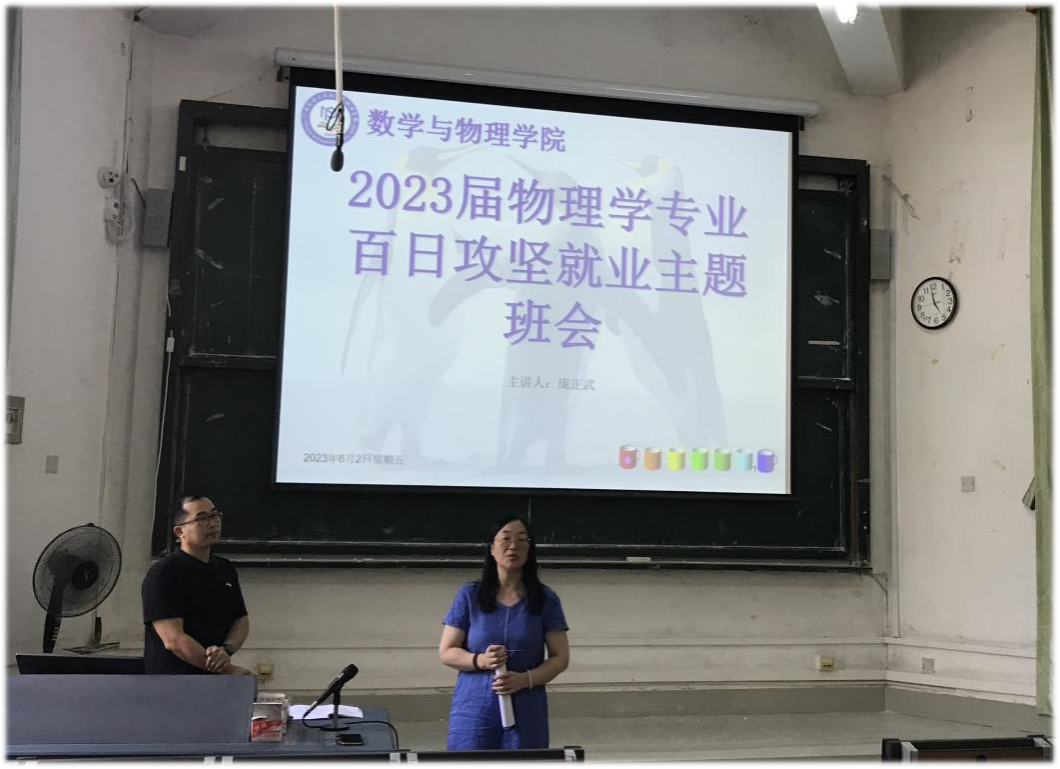 6月2日下午,2023届物理学专业在创新楼六梯开展百日攻坚就业主题班会,公司党委副书记邹同霞出席并讲话,19物理学专业班主任庞正武老师主持会议,2019级物理学专业毕业生参会。