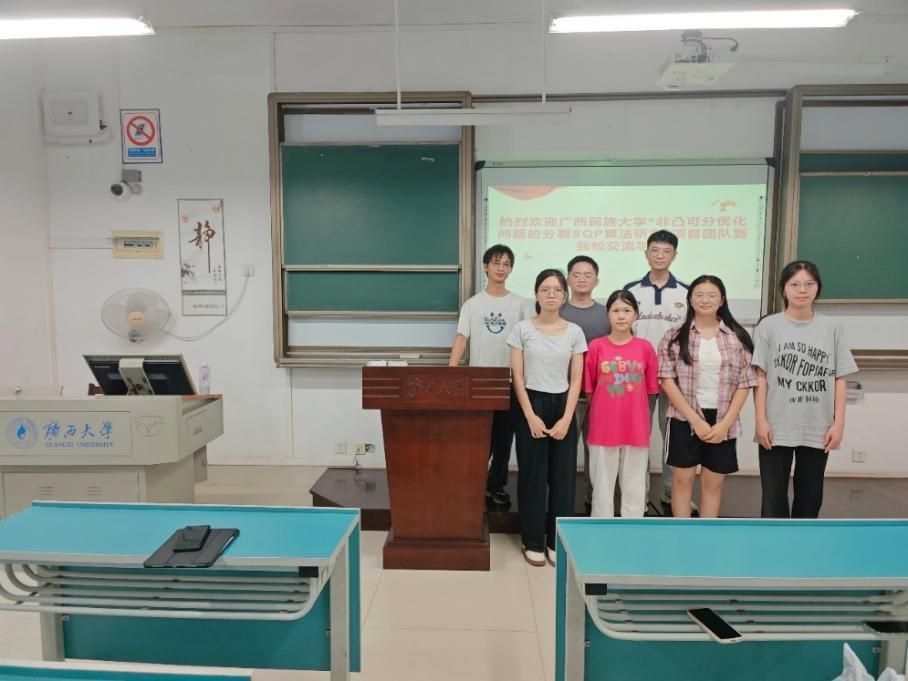 在交流过程中,团队成员展示了项目的研究进展,重点介绍了非凸可分优化问题的分裂SQP算法的研究成果,并与广西大学的师生探讨了当前优化算法在实际问题中的应用和挑战。广西大学的师生对项目组的研究方向提出了许多建设性意见,帮助项目团队更好地完善算法模型与优化策略。通过本次学术交流,双方不仅分享了各自的研究经验,也探讨了未来可能的合作方向。