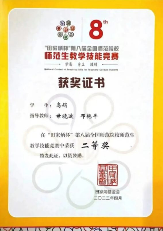 2023年4月14日至16日,由田家炳基金会赞助、浙江师范大学主办的“田家炳杯”第八届全国师范院校师范生教学技能竞赛决赛在浙江师范大学圆满落幕,公司2019级数应2班高娟同学荣获全国总决赛二等奖。