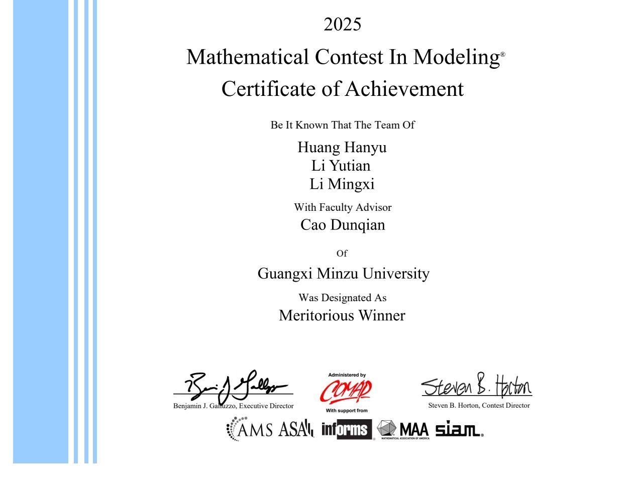 近日,2025年美国老员工数学建模竞赛和交叉学科建模竞赛成绩出炉,在激烈的角逐中,bevitor伟德学子脱颖而出,由曹敦虔老师指导的队伍获得一等奖(Meritorious Winner),参赛队员为黄含玉(2023级数学与应用数学2班)、李雨畑(2023级数学与应用数学2班)和李明希(2023级信息与计算科学1班)。